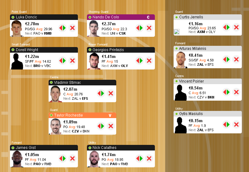 Η τελευταία αλλαγή, η παραμονή δηλαδή τελικά του Rochestie στην ομάδα, σε αντίθεση με το αρχικό πλάνο (τελικά ήταν εφικτή για 0,01Μ), της επιτρέπει να μην ...κυνηγά πλέον δύο πρωτοκλασάτους point guards κι έτσι της προσφέρει ευχέρεια αλλαγών, η οποία πάντως δεν είναι και τόσο επιτακτική αυτή την εβδομάδα. Όσο για τον Jerrells, δικαίωσε και με το παραπάνω τις προσδοκίες και αν και είχα επιφυλάξεις για το κατά πόσο αξίζει να παραμείνει αυτός βασικός και να βρεθεί ο Rochestie στον πάγκο, προτίμησα να παραμείνω στην αρχική απόφαση. Ο γκαρντ του Αστέρα βέβαια τα πήγε περίφημα στο ΣΕΦ κι έτσι το κέρδος της κίνησης αυτής ήταν μόλις 0,6 πόντοι. Πάντα όμως ο σκοπός σε αυτές τις περιπτώσεις είναι το μη χείρον βέλτιστον, αφού προφανώς ο καθένας που διαβάζει αυτές τις γραμμές αυτή τη στιγμή μπορεί να θυμηθεί κάποιες αποφάσεις του σε διλήμματα που δεν είχαν και την πιο ευτυχή κατάληξη.