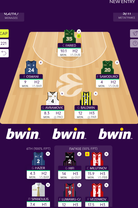 Πιο συγκεκριμένα για την ομάδα μου, είχα επιλέξει μια λίστα παικτών τους οποίους πίστευα από την αρχή της χρονιάς και με αυτούς λίγο πολύ πορευόμουν μέχρι σήμερα. Εκτός του Vezenkov, του οποίου την περίπτωση θα αναλύσουμε ξεχωριστά, είχαμε τους Baldwin, Hifi, Luwawu-Cabarrot, Osmani, Milutinov οι οποίοι και αποτελούσαν τον βασικό κορμό της ομάδας.