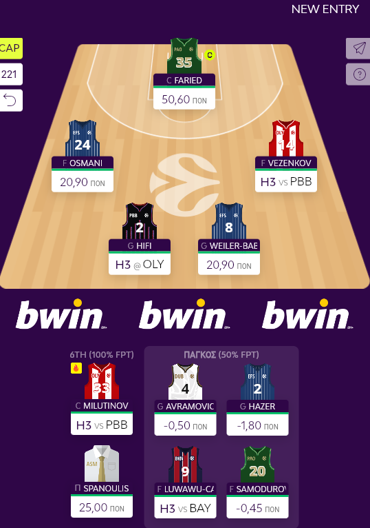 Στο θέμα τώρα της αρχηγίας, είχαμε από το Turn2 τον Faried και μένει να αποφασίσουμε αν τον κρατήσουμε ή αν ρισκάρουμε με έναν παίκτη του Ολυμπιακού. Αν και πιστεύω ότι ειδικά ο Vezenkov, σήμερα θα αντιδράσει και θα δώσει ένα καλό σκορ, για αυτό άλλωστε και τον κράτησα παρόλο τον μεγάλο ανταγωνισμό στην θέση, δεν μπορώ να αλλάξω αρχηγό με 25.3 σκορ, οπότε και θα κρατήσουμε αυτόν που έχουμε.
