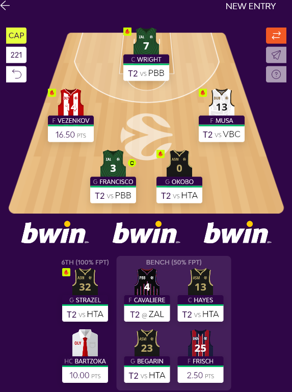 Ελπίζοντας ότι θα πάρουμε σήμερα κάτι καλύτερο, ανεβάζουμε στους βασικούς πέντε παίκτες (Fransisco, Wright, Okobo, Stazel, Musa), κρατώντας εκεί μόνο τον Vezenkov, από τον οποίο όμως θα αφαιρέσουμε το περιβραχιόνιο του αρχηγού, το οποίο θα πάει στον Fransisco, ο οποίος όπως προείπαμε ήρθε για αυτόν ακριβώς τον λόγο.