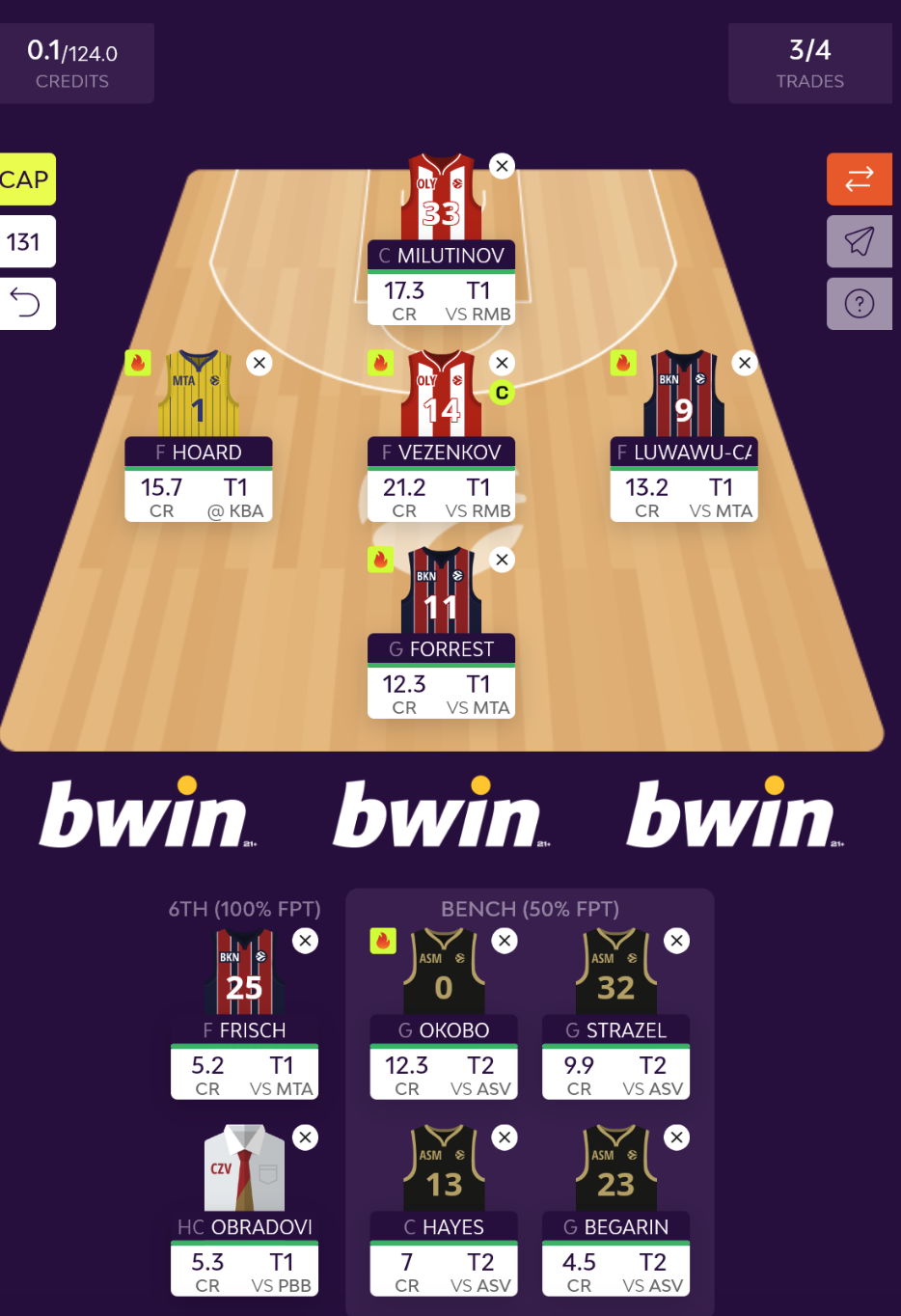 Στο Τ1 έχουμε τα βαριά μας χαρτιά με το δίδυμο του Ολυμπιακού να παραμένει παρά τον δύσκολο αγώνα με την Ρεάλ, ενώ σίγουρα θα παραμείνει και ο Hoard. Επίσης, ενώ Παρασκευή βράδυ είχε βγάλει εισιτήριο επιστροφής και ο Forrest η εμφάνιση που έκανε την Κυριακή στην ACB σε συνδυασμό με την διαφαινόμενη απουσία του Simmons τον κρατάνε στην ομάδα μας. Στο Τ2 είμαστε γεμάτοι Μονακό, με τους Okobo, Strazel, Hayes και Begarin, συνθήκη που δεν νομίζω να την αλλάξουμε καθώς η ενημέρωση για την επιστροφή των James και Theis είναι λίγο διφορούμενη.
