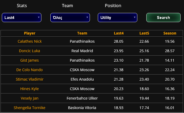 Όσον αφορά το πρώτο φίλτρο, αυτό των στατιστικών, βοηθά στην ταξινόμηση των παικτών βάσει του Last4, του Last5 και του season μέσων όρων τους. Ανάλογα με την επιλογή σας, οι διαθέσιμοι (βάσει των επιλογών σας στα άλλα φίλτρα) παίκτες θα ταξινομηθούν σε φθίνουσα σειρά, για το συγκεκριμένο εύρος παιχνιδιών. Αυτός που έχει τη μεγαλύτερη επίδοση θα βρεθεί ψηλότερα κι αυτός με τη μικρότερη, χαμηλότερα.